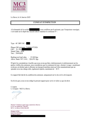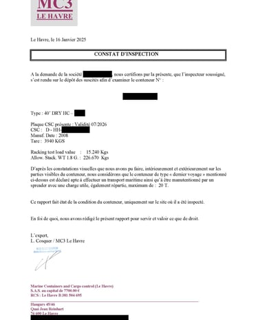 Tous nos conteneurs sont conformes aux normes CSC. Ce certificat atteste que chaque conteneur est apte au transport maritime et à être manipulé par un spreader avec une charge utile maximale de 20 tonnes, répartie de manière équilibrée.